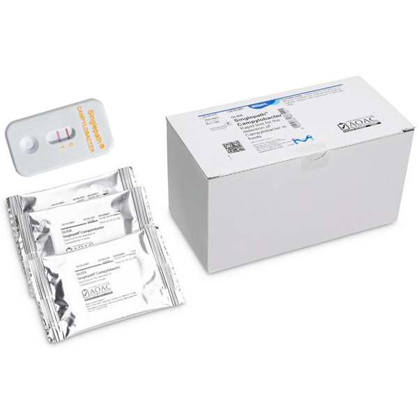 Singlepath® Campylobacter is a rapid diagnostic test, designed to detect Campylobacter bacteria in various food samples. Campylobacter is a genus of bacteria that can cause human infections, leading to symptoms such as diarrhea, fever, and abdominal cramps.The Singlepath® Campylobacter is an immunochromatographic rapid test based on gold-labeled antibodies to detect the presence of a specific antigen, in this case, the Campylobacter bacteria. The test includes a nitrocellulose membrane strip that is coated with antibodies specific to Campylobacter antigens. When the sample is applied to the test strip, any Campylobacter antigens present will bind to the antibodies on the strip, developing a visible test line. The test takes approximately 20 minutes to complete, and the results are interpreted based on the presence or absence of the test line. No additional equipment expenditure is needed.